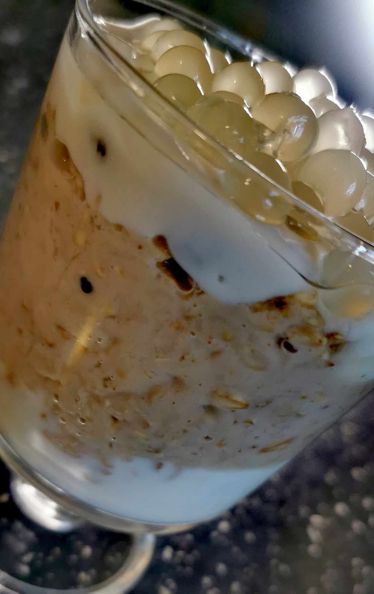 Al doilea strat - porridge de ovaz impreuna cu 2 plicuri de proteina vegana gust vanilie